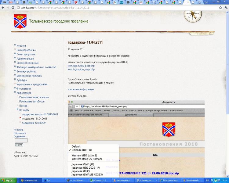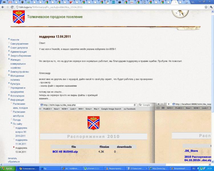 Вам уже был дан ответ, но вы видимо его проигнорировали, или не поняли? Разжёвываю: На сервере используется кодировка UTF-8 изначально и везде. Файлы, которые вы передаёте на сервер посредством ftp имеют в своём составе русские буквы. Для справки: windows 9x,Me,XP используют в консоли и WinAPI кодировки ISO, для русских версий - это windows-1251, так что передавая файл посредством реализации MS ftp протокола, вы передаёте его содержимое и его имя в указанной выше кодировке. И получается, что php работает в utf-8, и вы подсовываете ему данные в win-1251 - это и был по сути наш ответ вам. Естественно выводя одну кодировку в другой вы и получаете на выходе билеберду. Заглянул в ваш используемый скрипт - это TBmnet downloader. Скачал его, положил на тотже самый сервер, изменил в нём всего три строчки и он нормально всё отображает (для знающего php и имея информацию что мы вам предоставили - дело 5 минут). Можете убедится: http://www.luglink.net/_/tbnet/ Засим к вам парочка вопросов: Почему вы звоня на личный номер сотрудника хотите получить от него поддержку? (Телефон поддержки какбы указан в договоре) Почему мы должны за вас бесплатно выполнять работу, за которую платят вам? И кстати, а вам владелец сайта разрешил его использовать таким образом? |