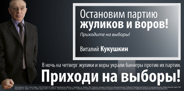 Кандидат Кукушкин повесил баннеры "Остановим партию жуликов и воров!", ночью они пропали. Повесил новые: "В ночь на четверг жулики и воры украли баннеры против их партии".