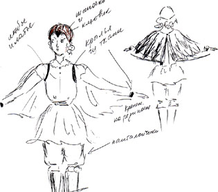 юбочка в фестончиками, крылышки, прикрепленные к запястьям, можно воротничок-жабо. приду домой - нарисую