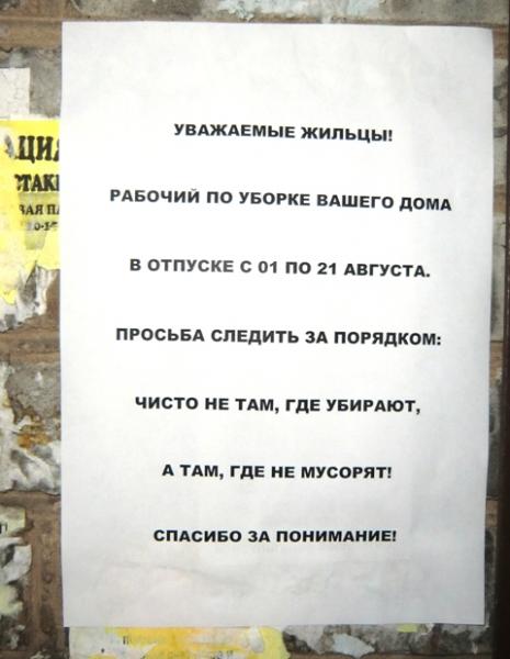 Вот такое объявление увидел на дoме. Это получается, если работник ушел в отпуск, то услуга всему дому оказываться не будет???