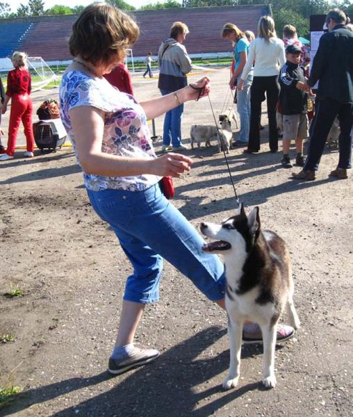 у меня в новгороде попросили визитку и расспрашивали о родителях шайнис. уже хотят наших щенков. между рингом и бестами гуляли по новгороду и убедились, что там хаски тоже диковинка. на выставке был только один хаски из новгорода - кобель юниор. но он не попал даже в сравнение на лучшего юниора (хотя мальчик красивый, черно-белый разноглазик. к сожалению, у него некомплект зубов и хвост завален на спину). так что шайнис выиграла люп в неравной борьбе с самой собой. а вот в сравнении на лучшего представителя породы мы проиграли, действительно, великолепной суке татьяны солдатовой из спб - шоколадной 2-годовалой, привоз из сша |