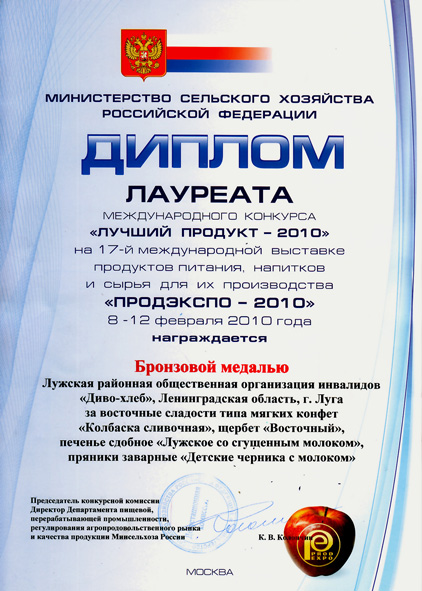 дипломом и золотой медалью награждены ооо "живые соки" за соки прямого отжима по госту и с фруктозой, за сироп. дипломом и серебряной медалью награждены ооо "живые соки" за сильногазированный напиток "веселый круг" дипломом и бронзовой медалью награждено лроои "диво-хлеб" за пряники заварные, печенье сдобное, щербет и колбаски сливочные. |