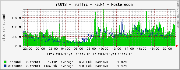 На данный момент 2Мбит/с Ethernet с безпроблемным увеличением (хоть завтра) до 4 Мбит/с... Вот только Ethernet от ростелеком работает отвратительно (отсюда и ниблюдают скачки пингов во внешнюю сеть юзеры работающие через нас, ибо сеть ПД у РТ построена на хуавеях в основном....), с понедельника мы переходим на синхронный E1 канал (задержки не более 50ms при любой нагрузке на канал)....