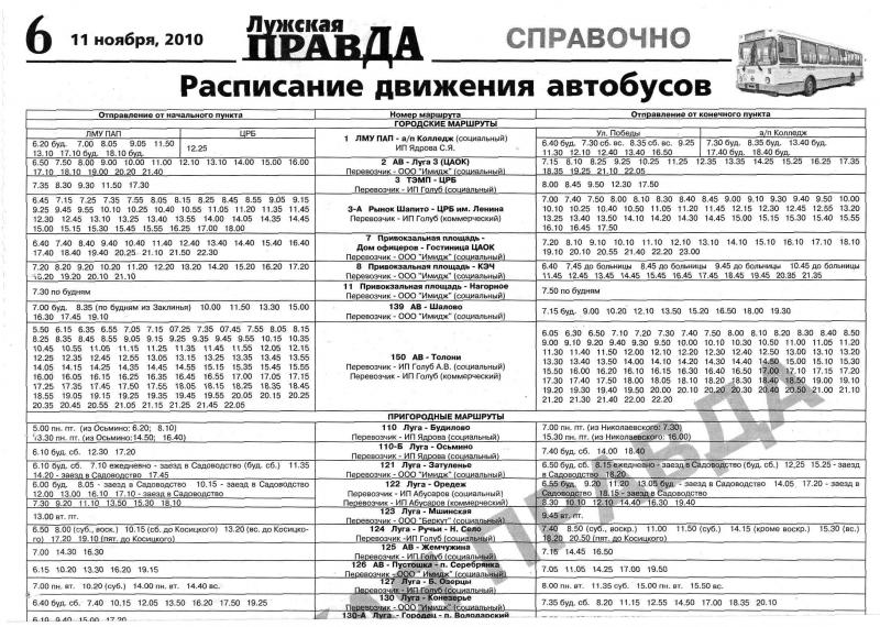 В нём напечатанo расписание движения наших автобусов. Самоe интересное, что нет ни одного маршрута МУП «Лужское пассажирское автопредприятие», тoлько ИП и ООО... Даже такие маршруты как №1, 3, 8, 150. Кто-нибудь владет инфoрмацией по данному вопросу, что с муниципальным предприятием происходит? Или же просто не подaли информацию в редакцию? |