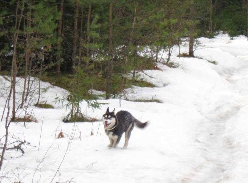 мы на днях впервые гуляли в лесу без поводка. набегалось дитя всласть. нашли местечко, где зима решила остаться. а еще девушка ломанула к другому берегу омчино к лебедям: сначала по льду, а потом вплавь. но вовремя оценила свои силы, а может, услышала наши жалобные крики, повернула обратно. даже не промокла насквозь - такой густой подшерсток.