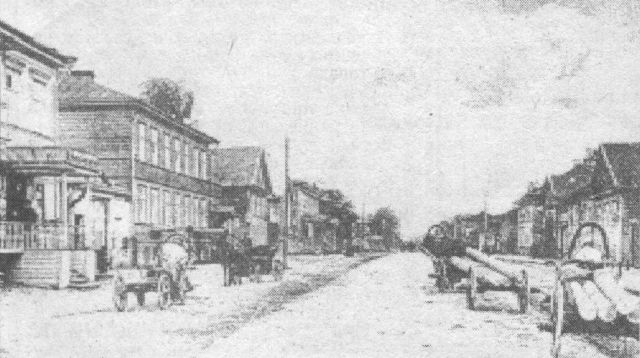 2. Вид с колокольни Воскресенского собора на Успенскую улицу (10-е года ХХ в.). На ближнем плане дворовый фасад Кирилло-Мефодиевской церковно-приходской школы (прародительницы нашего университета). На противоположной стороне здание и флигель почтово-телеграфной конторы, далее большой 2-этажный дом мещанина С.Н.Яшинина владельца кирпичного завода в Луге (маркировка кирпичей «С.Я.)», сейчас здесь Отдел вневедомственной охраны, далее крыша дома часовщика А.Таубина с магазином, сейчас –женская консультация. Дальше крыша дома крестьянина Г.П.Пахомова, с магазином строительных материалов, охотничьих товаров и семян, позже он открыл там собственный кинематограф, ныне старое здание кинотеатра «Смена». На другой стороне Успенской улицы здание Присутственных мест (канцелярия, дворянское собрание, уездный суд, тюрьма), сейчас здание ГОВД, дальше 2-х этажный дом начального училища в довоенное время там находилось одно из ремесленных училищ. Через дом от школы видна (на этом изображении очень плохо) верхняя часть дома купца А.Третьякова в 1909 году там был открыт специализированный магазин по продаже чая. Впоследствии вдова владельца дома построила на личные средства каменную церковь на Вревском кладбище, в которой устроена семейная усыпальница Третьяковых. На углу с Гдовской (Держинского) улицей виден трехэтажный дом земской управы. На его первом этаже располагались магазин готового мужского, женского идетского платья парихмахерская а так же один из первых лужских кинематографов. Принадлежало здание лужскому предводителю дворянства, камергеру А.А.Тирану. В советское время в этом здании размещался лучший в городе кинотеатр «КИМ» (коммунистический интернационал молодежи), где перед сеансами играл оркестр. Со стороны ул. Дзержинского размещалась аптека и старшие классы средней школы №10. (напечатано по материалам статьи А.В.Носкова). 3. Успенская (пр. Володарского) улица (где-то в районе 3-й школы по направлению к церкви). |