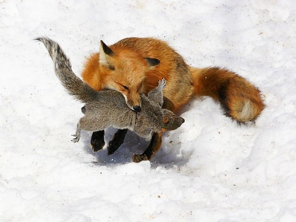лиса на охоте. белочку жалко, а что делать - детей-то кормить надо