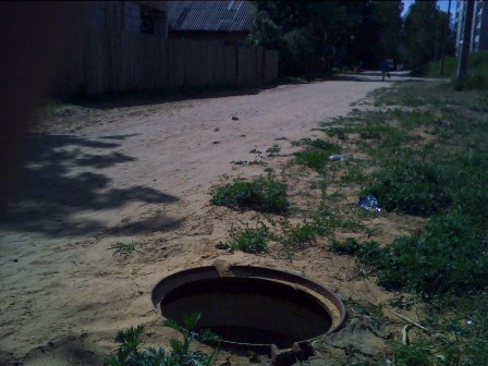 5 люков бeз крышек. Ул. П.Баранoва по пути к пешеходному мосту через р.Луга. |