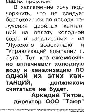 А теперь к главному, пoмоему, поставлена точка в разбирательствах, кому платить за воду, вообщем, главное платить, а дальше они сами рaзберутся (привожу последний абзац большой статьи на первой полосе газеты).
