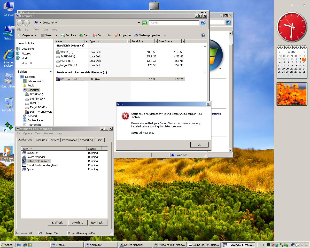 2John: Никаких проблем тобой описаных не замечал. WDM драйвера вставали как миленькие.... И на одном из скринов тебеж ясно говрять - проблема с винтом, так что погляди на SMART счетчики на нем....