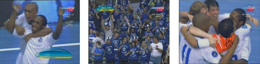 Я все-таки поражаюсь, какое обращение с мячом, какие карусели комбинаций умудряются закручивать эти футзалисты. И интрига была хоть куда, выигрывая после первого тайма 1-0, во втором Динамо немного подсело и отдало инициативу Бумерангу и за 2 мин. те сравняли счет. Но неожиданно за 30 сек. до конца московский бразилец - Пула, забивает победный гол. Молодцы! Увы, россиян в команде не так уж много. Внизу несколько кадров с TV-тюнера. |