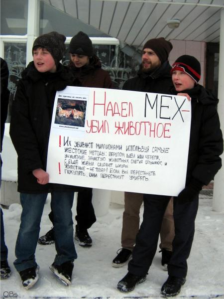с опозданием на полчаса перед дк собрались человек десять-пятнадцать, преимущественно школьники, с самодельными плакатами в руках. покричали что-то про белок с зайчиками, потом женщина, занимающаяся рекламой меховой распродажи, сказала им, что она вызовет милицию, т.к. они мешают ей работать, и весь "пикет" разбежался.