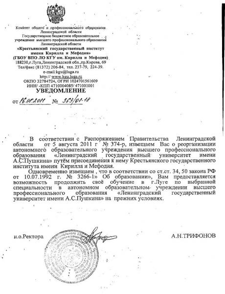 правительством ленинградской области принято решение по объединению крестьянского государственного института имени кирилла и мефодия в городе луге с ленинградским государственным университетом имени а.с. пушкина. распоряжение правительства ленинградской области об этом подписал сегодня губернатор региона валерий сердюков.