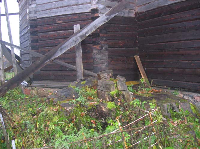 В церви сейчас идет ремонт, ее пришлось разбирать и собирать заново из-за того, что корни росщего рядом дерева стали разрушать здание. От этого дерева остался пень диаметром больше 2 метров