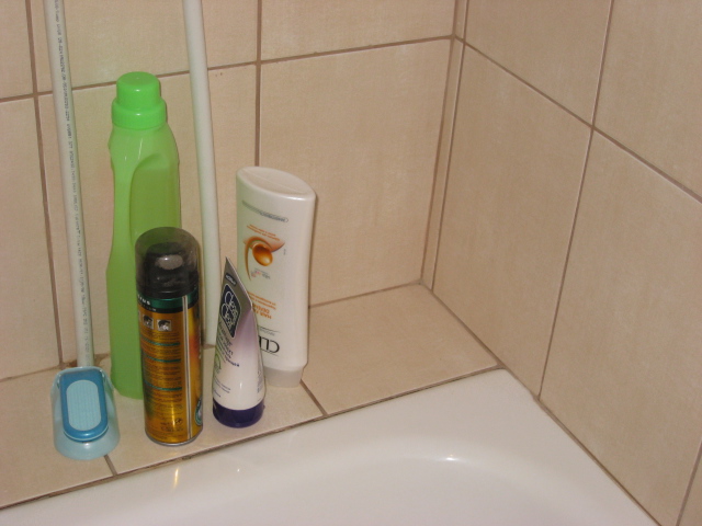 вот и у меня так сделано, только ты клал под углом половинку плитки, а у меня целая так поставлена. очень удобно, и точно нигде не течет
