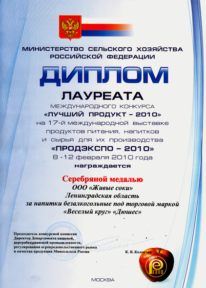 дипломом и серебряной медалью награждены ооо "живые соки" за сильногазированный напиток "веселый круг"